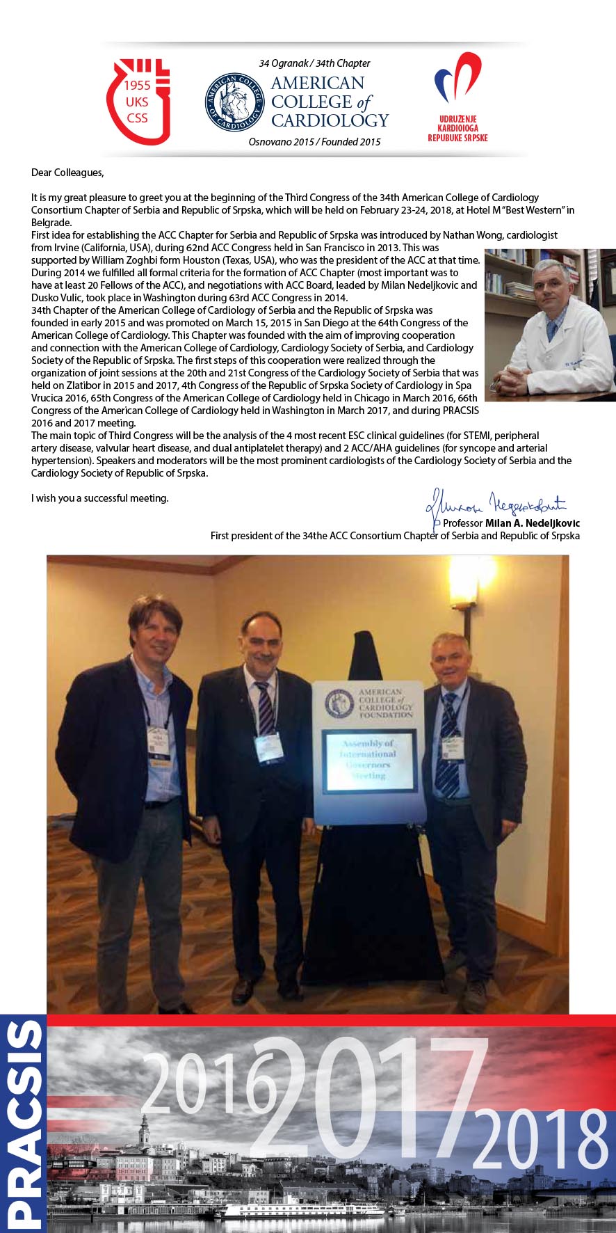 Welcome to the ACC Consortium Chapter for Serbia and Republic of Srpska. This Chapter was founded on March 15 2015 in San Diego. It consists of two cardiac societies: Cardiology Society of Serbia and Republic of Srpska Society of Cardiology. Cardiology Society of Serbia was founded in 1955 and has 1050 members, 17 working groups, 10 subsidiaries, and 22 FACCs. Republic of Srpska Society of Cardiology was founded in 2000 and has 101 members, 8 working groups, and 5 FACCs.